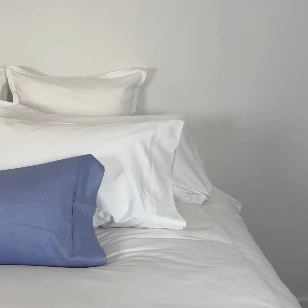 We've taken our hotel decorator favorite rectangular feather pillow insert and enclosed it in our unique periwinkle linen cover. The pillow insert comes preassembled in a white zippered pillow protector and the periwinkle linen cover. Perfect for creating a positive periwinkle pop of color on your bed.